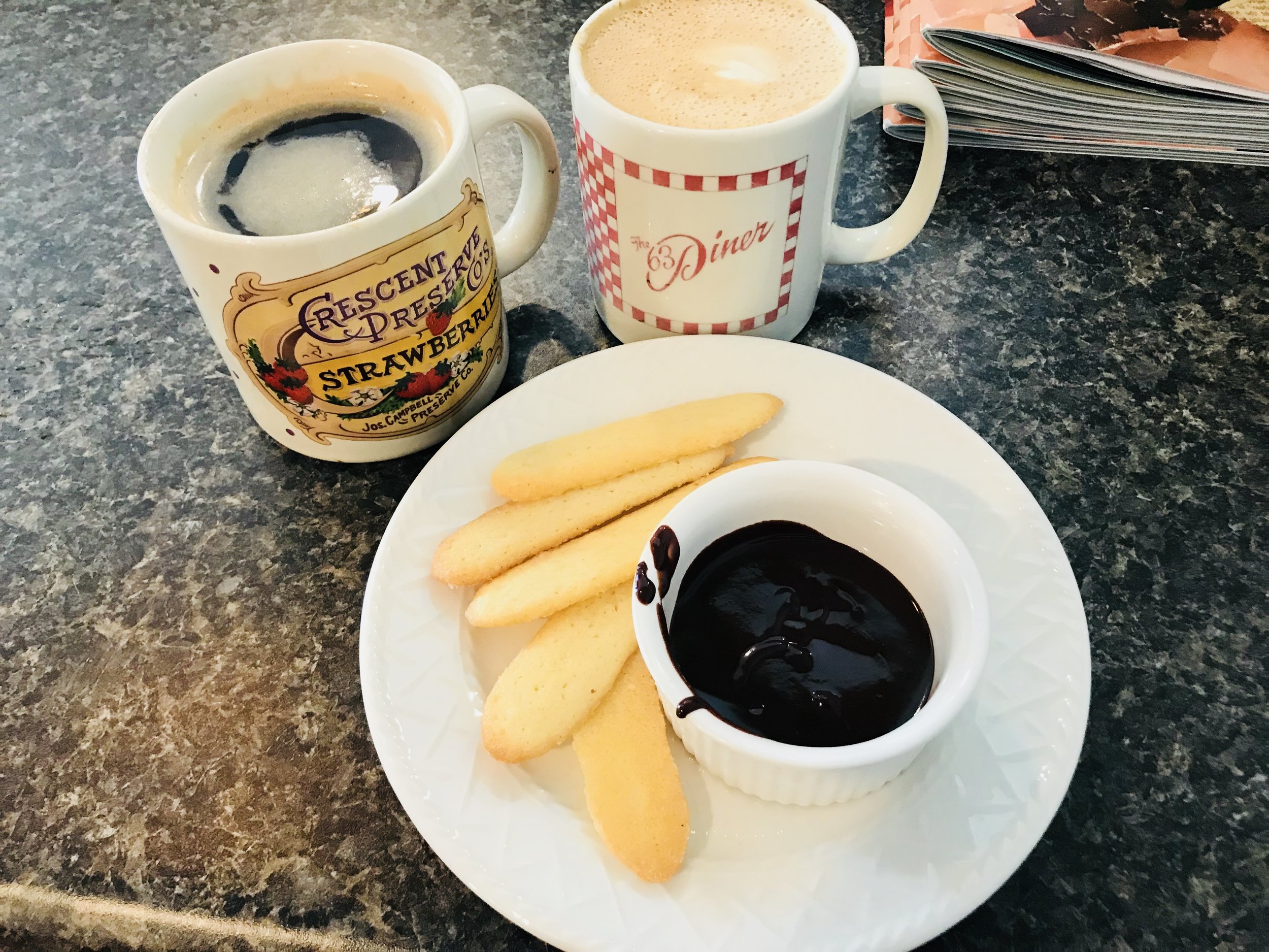 The kitties and the space aren’t the only things to love about Papa’s. The coffee is AMAZING, sourced from Fretboard, a local roaster. Fretboard trained the staff in proper barista technique and it has paid off- patrons sometimes come in just for the coffee. I also ordered Madelienes served with chocolate dipping sauce. Perfection!